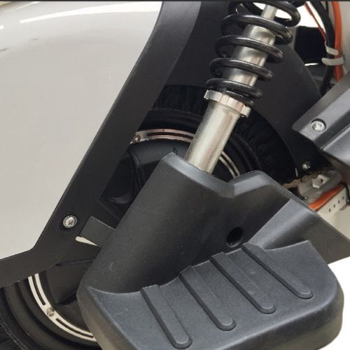 - У электроскутера мягкая подвеска т.к. установлен передний и задний амортизатор, что делает езду по грунтовой дороге с корнями и ямами очень комфортной.