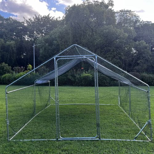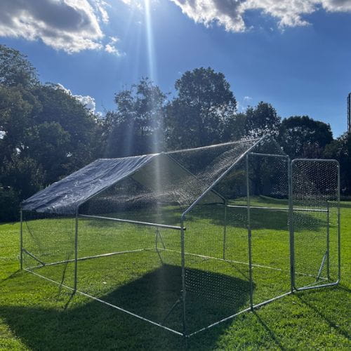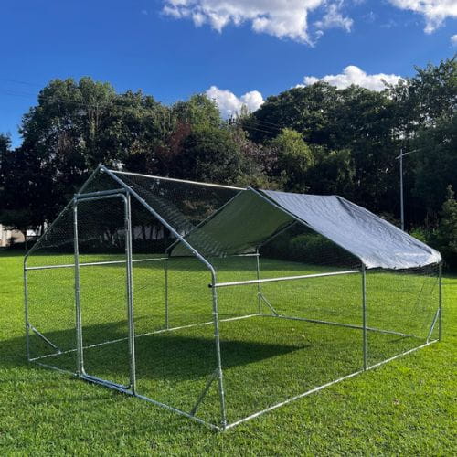 Каркас летнего курятника изготовлен из металлических оцинкованных труб диаметром 25 мм. Покрытие: 160г/м2 влагостойкая ткань полиэтилен, сетка рабица диаметром 0,9мм.