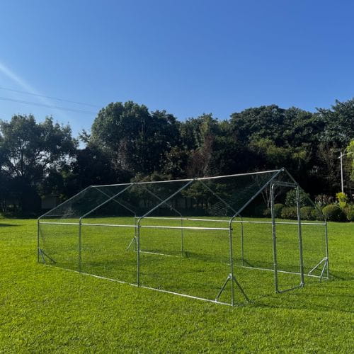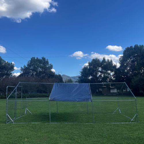 Каркас летнего курятника изготовлен из металлических оцинкованных труб диаметром 25 мм. Покрытие: 160г/м2 влагостойкая ткань полиэтилен, сетка рабица диаметром 0,9мм.