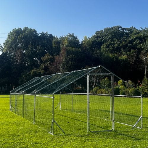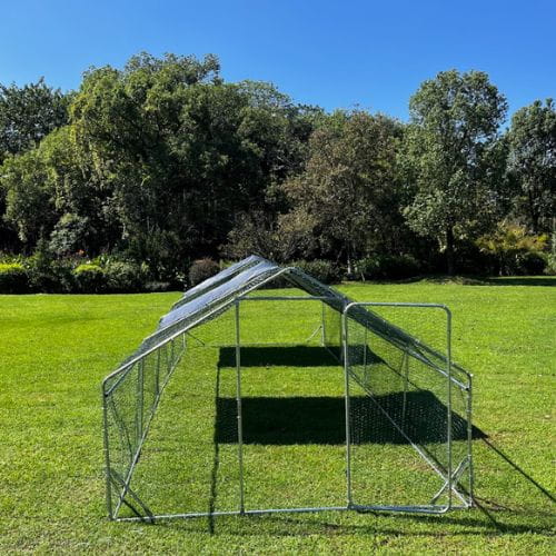 Каркас летнего курятника изготовлен из металлических оцинкованных труб диаметром 25 мм. Покрытие: 160г/м2 влагостойкая ткань полиэтилен, сетка рабица диаметром 0,9мм.